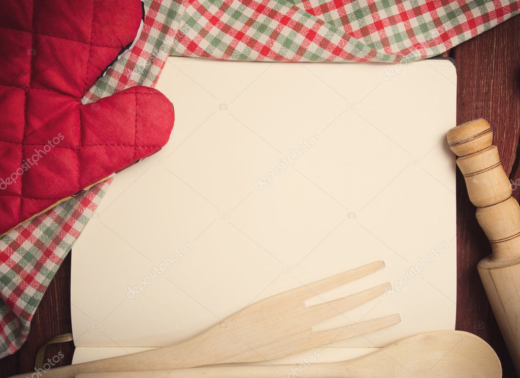 Página de recetas en blanco con servilletas y utensilios de cocina en la mesa de madera — Foto ...